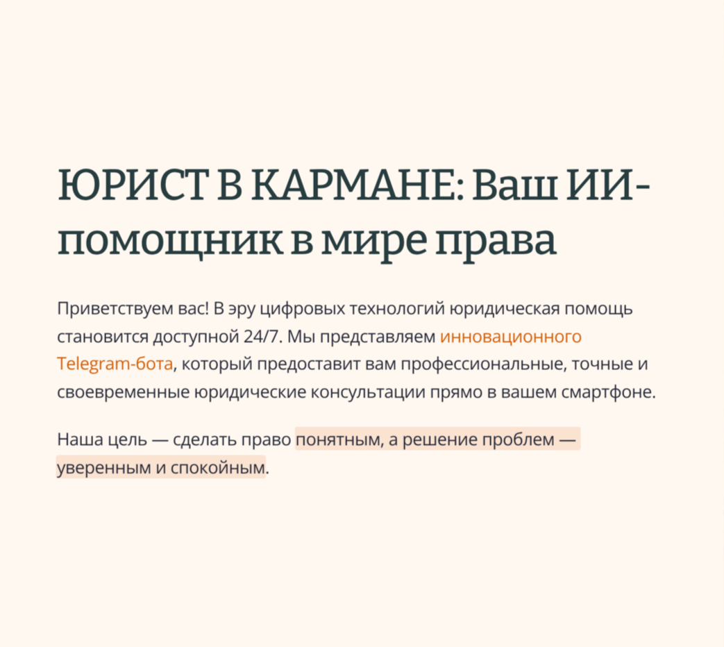 - Мы представляем инновационного Telegram-бота, который предоставит вам профессиональные, точные и своевременные юридические консультации прямо в вашем смартфоне.